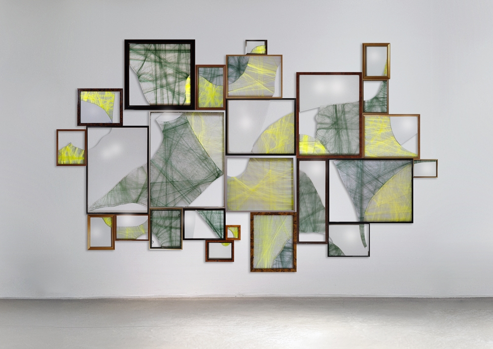 Dans cette œuvre, j’ai récupéré toutes cadres aux verres cassées, dans les différentes communauté d’Emmaus, les brocantes et les trottoirs.