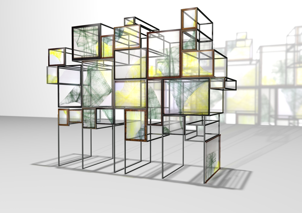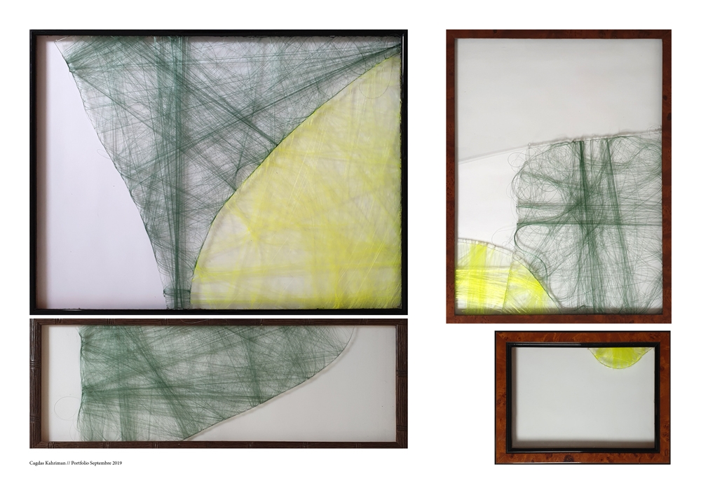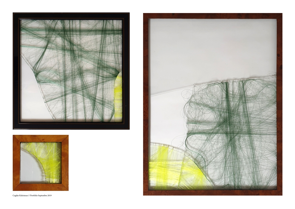Les verres cassés sont parfois enrobés de fils verts et jaunes, leur conférant une trame pour mieux souligner les brisures et les parties manquantes. Une cartographie se profile au gré des nouveaux arrivants en suivant la ligne d’éclat.